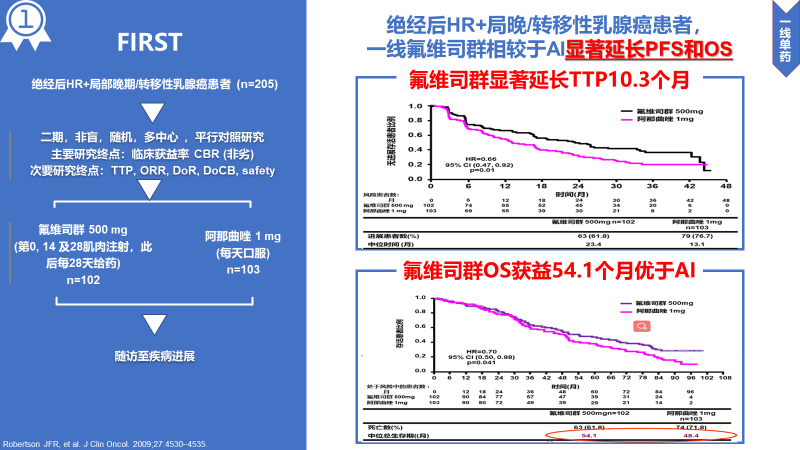 时光如水岁月如歌,时间一下子到了21世纪的2009年,氟维司群的第一个重磅研究Ⅱ期FIRST研究公布了初步结果2,既往已有研究证实氟维司群250mg与AI类效果相当,FIRST研究旨在对比500mg氟维司群与标准治疗方案AI类1mg阿那曲唑一线治疗晚期乳腺癌的疗效,两组的TTP分别为23.4和13.1个月,差距有统计学意义,氟维司群组显著延长TTP 10.3个月,并且在后来的OS分析中氟维司群同样优于AI,可以达到将近5年的OS(54.1个月)。