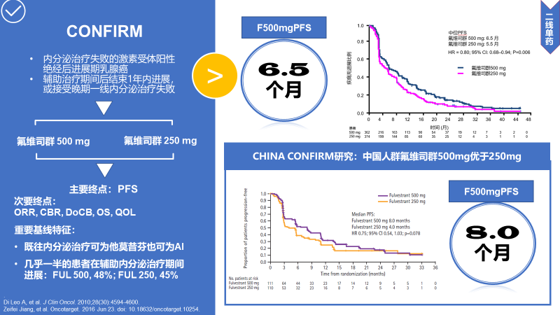 2010年,氟维司群第二个重磅研究CONFIRM研究公布了结果3,该研究为Ⅲ期研究,入组辅助内分泌治疗期间或结束后1年内进展或接受晚期一线内分泌治疗失败的患者,对比应用氟维司群500mg与250mg的疗效,既往的辅助抗雌治疗可以是TAM也可以是AI,结果显示氟维司群500mg效果优于250mg,PFS显著延长,达到6.5个月;随后的CHINA CONFIRM研究则沿袭了CONFIRM的研究设计,只是入组人群全换成了中国人,结果对中国人更有说明意义,研究结果同样显示出氟维司群500mg对于晚期抗雌失败的乳腺癌患者疗效优于250mg,PFS达到8个月。