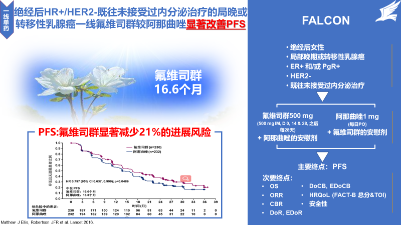 如果认为FIRST只是一个Ⅱ期研究不足以说明问题的话,再来看一个氟维司群单药治疗的重磅研究2016年公布的FALCON研究4,头对头比较了氟维司群与晚期内分泌标准治疗方案阿那曲唑用于绝经后HR+既往从未接受过内分泌治疗的乳腺癌患者的疗效和安全性,此类人群更为“纯粹”和“干净”的人群,最少的获得性耐药突变,更有利于直接对比两个药物的疗效,使得在此类人群比较的结果对临床实践具有很强的指导价值。结果显示氟维司群较阿那曲唑显著改善PFS,氟维司群单药用于晚期一线治疗PFS可达16.6个月,减少了21%的进展风险。