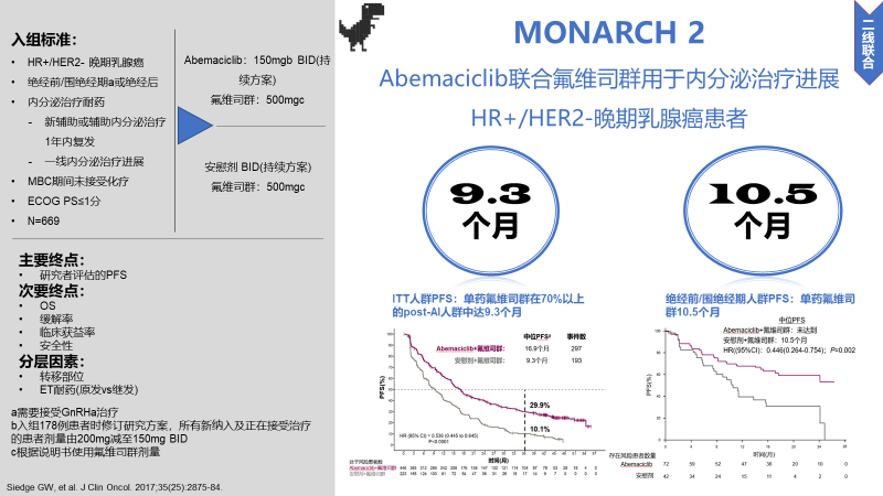 我们先来看2017年的MONARCH-2研究5,这是一项全球多中心双盲随机对照研究,旨在评价内分泌耐药的晚期HR+乳腺癌患者使用CDK4/6抑制剂Abemaciclib联合氟维司群与氟维司群单药的疗效和安全性对比,内分泌耐药的定义为新辅助、辅助内分泌治疗期间或辅助内分泌治疗完成1年内疾病复发,或晚期一线内分泌治疗中进展,且此研究排除了针对晚期疾病进行过化疗的患者,主要终点是PFS。