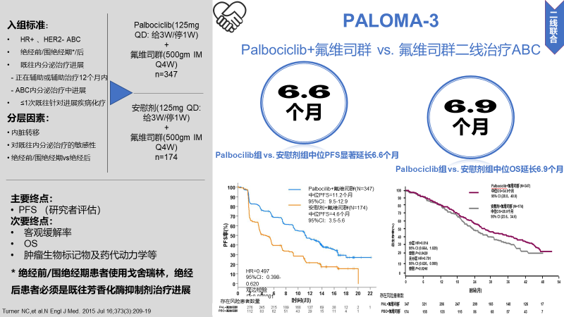 2018年发表的PALOMA-3研究6同样入组的是既往内分泌治疗进展(耐药)的绝经前/围绝经期或绝经后的患者,允许≤1次针对进展疾病的化疗,比较Palbociclib联合氟维司群对比氟维司群单药的疗效和安全性。结果分析显示联合治疗组与单药组PFS分别为11.2个月和4.6个月,联合组PFS显著延长了6.6个月,同时在OS的表现上,尽管联合组与单药组对比OS在总人群中并未达到统计学意义,但联合组较单药组OS延长了将近7个月(6.9个月),具有临床意义。