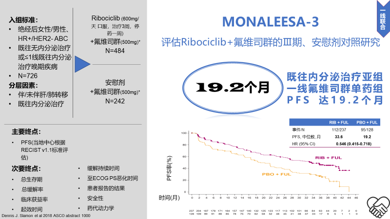 这样的结果给了我们很好的启示:既往的FALCON研究中氟维司群单药达到了16.6个月PFS,显著优于AI;但对这个结果我们会经常提出质疑,因为它入组的人群绝大多是denovo的患者,与我们临床实际人群有很大的出入。而在MONALEESA-3研究中,入组的人群50%是denovo的患者,另一部分是既往接受了辅助内分泌治疗(TAM或AI)晚复发的患者,这也在一定程度上验证了氟维司群单药治疗的有效性。