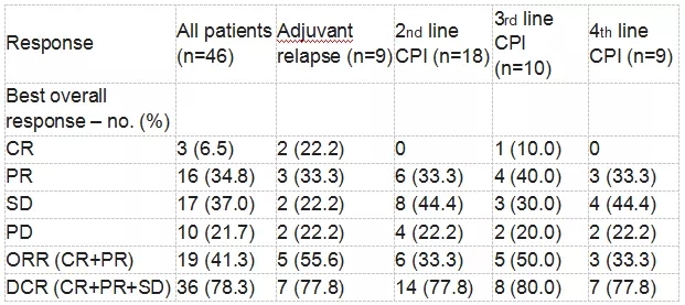 表1. 辅助化疗后6个月内病情复发以及2-4线患者的CPI治疗反应