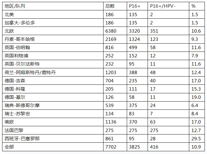 表1. EPIC-OPC研究中p16+/HPV-按地区和队列划分