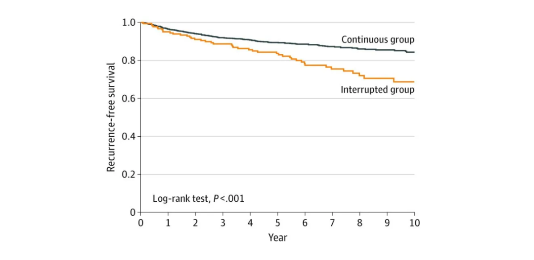 中位随访6.0年,184例治疗中断患者中有44例(24%)发生侵袭性乳腺癌复发或死亡,1212例连续患者中有153例(13%)发生侵袭性乳腺癌复发或死亡(对数秩P<0.001)。早期中断曲妥珠单抗的患者侵袭性乳腺癌复发或死亡的风险显著增加(校正后HR=1.56;95%CI:1.10~2.21)。