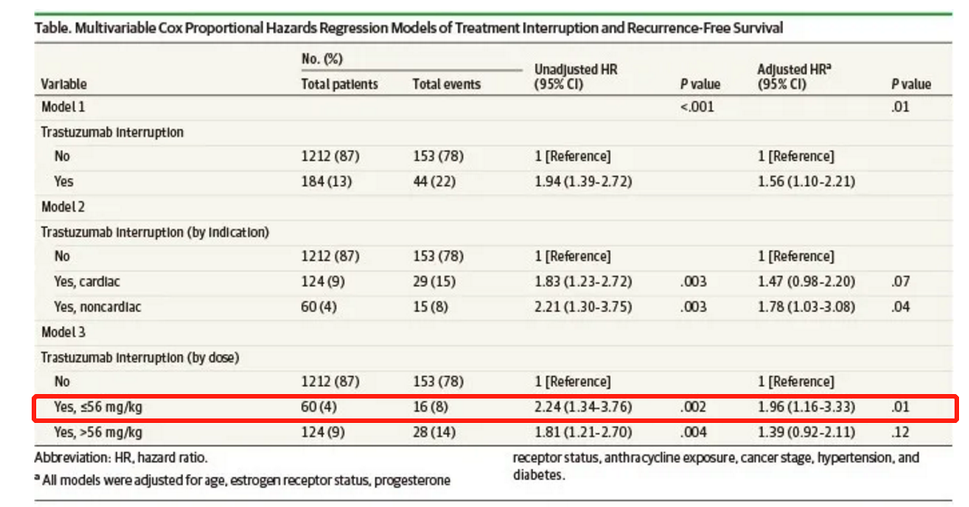 调整年龄、蒽环类药物、癌症分期、雌激素/孕激素受体状态、高血压和糖尿病等因素后,通过适应症(无中断、心脏中断或非心脏中断)或曲妥珠单抗累积剂量(不间断,≤56 mg/kg,或>56 mg/kg)等多变量Cox比例危险模型来评估RFS与治疗中断之间的关系,曲妥珠单抗的剂量临界值为56 mg/kg(相当于6个月的曲妥珠单抗累积剂量)。