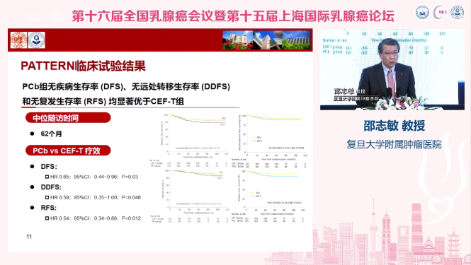 余科达教授:该话题可分为国内和国际两部分进展进行阐述。此次大会“中国之声”环节,四位教授分别对我国乳腺癌相关研究进展进行了汇报。邵志敏教授汇报了中国研究者发起的已经在今年JAMA Oncology上发表的PATTERN临床研究与在Cell Research上发表的FUTURE研究,分别从早期和晚期角度体现了三阴性乳腺癌(TNBC)的治疗策略。其中,PATTERN研究在全球首次证实含铂方案(每周PCb*18次)在TNBC术后辅助治疗中的价值,并得到是阳性结果,5年DFS的绝对获益达到6.2%(86.5% vs 80.3%)。该试验设计之初受到入组时间的限制,对照组是当时标准的CEF*3-T*3方案,因此,无法与当前的标准方案EC*4-wP*12进行比较。但是两种方案都是可选策略。因此,对于有心脏风险、难以应用蒽环类药物或者存在gBRCA 1/2基因突变的可手术TNBC患者,wPCb是一种不错的辅助治疗选择。