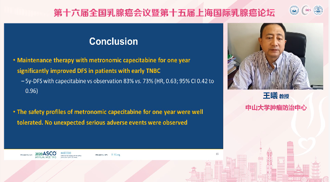 王曦教授汇报了中山大学肿瘤防治中心SYSUCC-001研究,该研究是继TNBC中辅助化疗联合卡培他滨的CBCSG-010研究和新辅助化疗后非pCR患者应用卡培他滨辅助进行强化的Create-X研究之后,又证实了TNBC标准辅助治疗之后,再辅助强化1年卡培他滨节拍化疗的良好疗效,为TNBC的辅助治疗添砖加瓦。但SYSUCC-001研究也只是证实了卡培他滨治疗的有效性,依然没有指出为什么有效。众所周知,TNBC是一组异质性疾病,目前化疗仍占主导地位,卡培他滨应用的本质是化疗强化,而不是因为卡培他滨对TNBC的潜在“靶点”有作用。因此,虽然在化疗占主导地位的当前情况下,这一结果令人鼓舞;但是未来研究的主要方向仍是探讨减毒、增效的三阴靶向方案,以提高TNBC患者的治疗疗效。