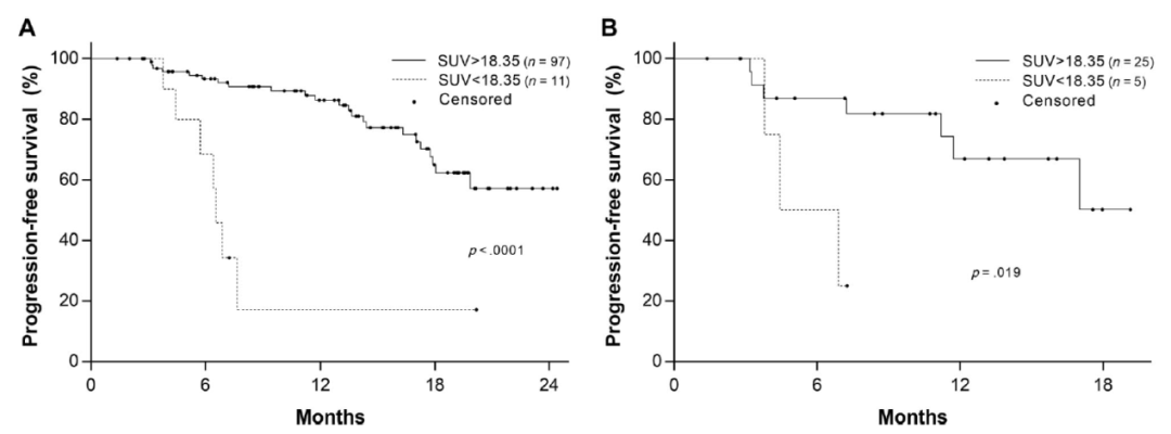 图1. 生长抑素类似物(SSA)单药治疗G1-2级胃肠胰神经内分泌肿瘤患者无进展生存率的生存分析,基于68Ga-DOTATATE最大SUV(SUVmax)临界值为18.35。低SUVmax组的无进展生存期明显更短,(A)所有108例患者(Mantel-Cox检验p<0.0001)。(B)30例先前未经SSA治疗患者(p=0.019)。缩写:SUV,标准化摄取值。