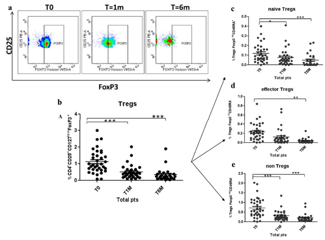 图1。奥曲肽LAR治疗期间Treg细胞和Treg亚群减少:(a)流式细胞术分析具有代表性的样本,显示1个月和6个月治疗后患者循环Treg减少。(b-e)奥曲肽LAR治疗1个月(T1M)和6个月(T6M)后外周Treg、幼稚Treg、效应Treg和非Treg降低。Treg以T细胞CD4+CD25+CD127lowFoxP3+的百分比表达(b);幼稚Treg以Tregs CD127lowFoxp3intCD45RA+的百分比表示(c);效应Tregs表示为CD127lowFoxp3hiCD45RA-Tregs的百分比(d);非Treg以CD4+CD25 +CD127lowFoxp3intCD45RA-的百分比表达。* p<0.05;** p<0.005;***p< 0.0005。