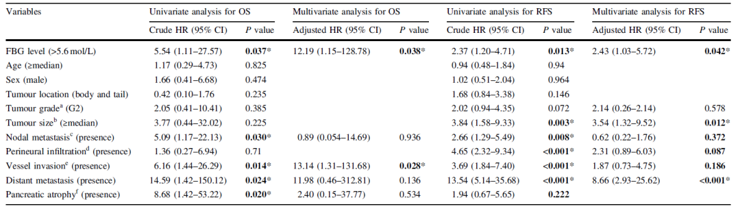 OS:总生存期, RFS: 无复发生存期, CI:置信区间, HR:风险比;* P< 0.05表示显著统计学意义。a,1例患者没有肿瘤分级资料;b,1例患者没有肿瘤大小的数据;c,14例患者没有淋巴结转移的资料;d,10例患者无周围神经浸润资料;e,10例患者无血管侵犯资料;f,19例患者无胰腺萎缩的资料。