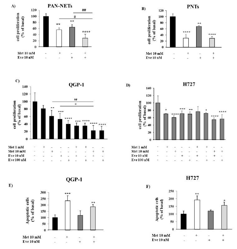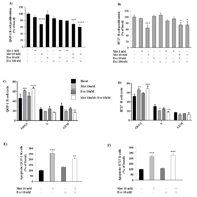 图1. 二甲双胍和依维莫司对神经内分泌肿瘤细胞增殖和凋亡的影响。(A,B)为了测量细胞增殖,该研究用二甲双胍10mm和依维莫司10nm单独或联合培养原代NET细胞24小时,然后用BrdU培养24小时。(C,D)为了测量细胞增殖,QGP-1和H727细胞系分别与二甲双胍(1-10 mM)和依维莫司(10-100 nM)单独或联合培养24小时,然后用BrdU处理2小时。(E,F)该图显示了二甲双胍(10mm)和依维莫司(10nm)单独或联合治疗后凋亡细胞的百分比。只有二甲双胍10mm能显著提高细胞凋亡率。