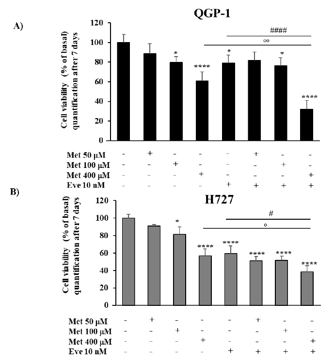图2. 二甲双胍(Met)和依维莫司(Eve)对QGP-1和H727细胞活性的影响。(A, B)将细胞与二甲双胍(50μm、100μm、400μm)孵育,依维莫司(10 nM)处理,或依维莫司(10 nM)与二甲双胍(50μm、100μm、400μm)联合处理7天。与单药相比,二甲双胍400μm和依维莫司10nm联合治疗可有效降低两种细胞系的生存能力。