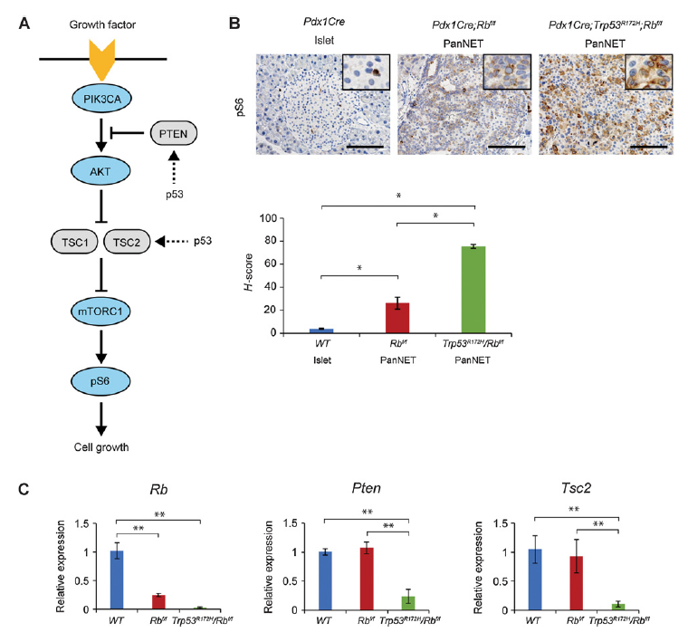 图2. mTOR通路在Pdx1-Cre、Rbf/f和Pdx1-Cre、Trp53R172H、Rbf/f胰岛细胞和PanNETs中的逐步上调。A.该研究中发现的抑制mTOR信号通路的p53靶基因的示意图。B. mTOR通路的激活,通过免疫组化方法分析Pdx1-Cre胰岛、Pdx1-Cre、Rbf/f PanNETs、Pdx1-Cre、Trp53R172H、Rbf/f PanNETs中pS6表达的H-score。比例尺,100mm。在这些细胞中,pS6表达的H-score呈逐步升高的趋势。C,Pdx1-Cre (N=3), Pdx1-Cre;Rbf/f (N=3), 和Pdx1-Cre;Trp53R172H;Rbf/f (N =4) 3 ~ 8月龄小鼠分离的胰岛细胞qRT-PCR检测。*P< 0.05;**P < 0.01。