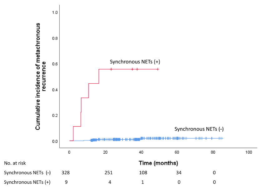 图1. Kaplan-Meier估计初诊时同时性神经内分泌肿瘤(NETs)的累积异时性复发发生率。