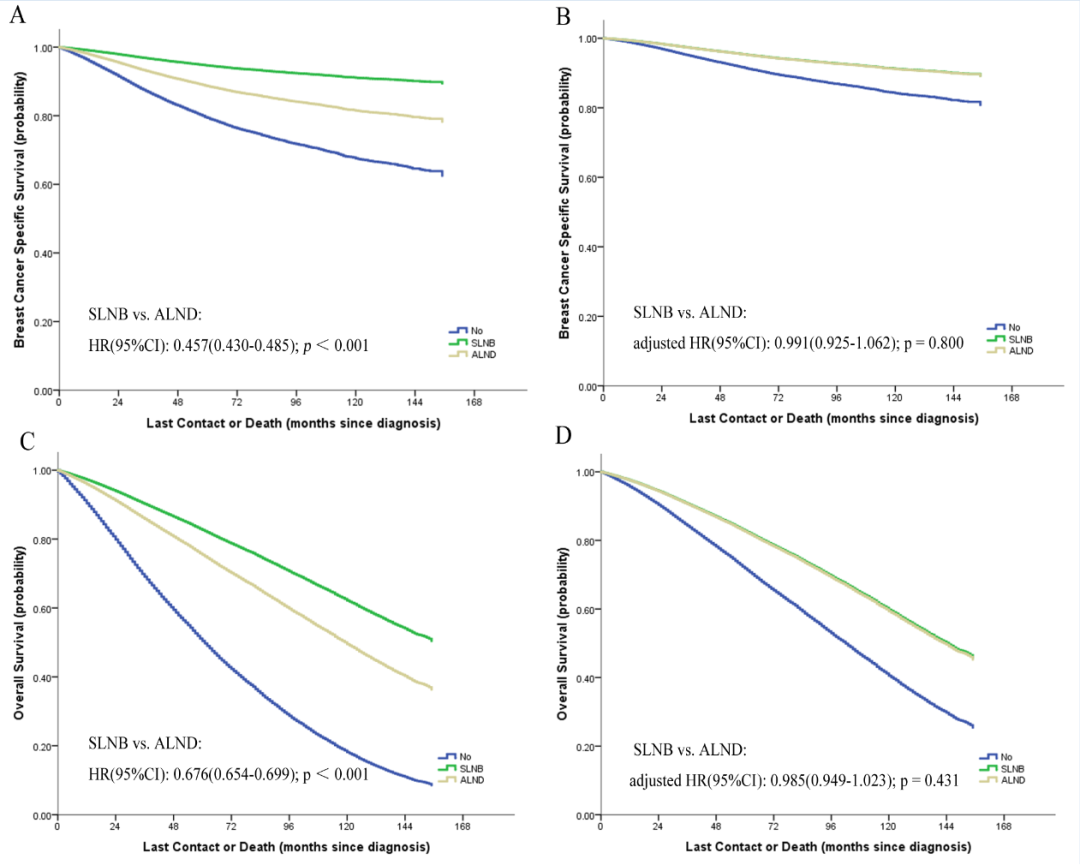 老年性乳腺癌(≥70岁)且合并腋窝淋巴结转移的人群中,腋窝淋巴结清扫术(ALND)是否一定优于单纯腋窝前哨淋巴结活检术(SLNB)?目前尚缺乏相关研究。这项研究旨在探索分析老年乳腺癌中,腋窝淋巴结外科处理方式与生存的关系。