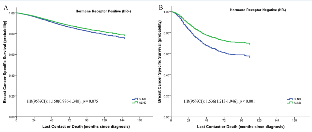 图2. 经匹配后的pN1期患者中,HR+人群(a)和HR-人群(b)中SLNB与ALND的生存曲线