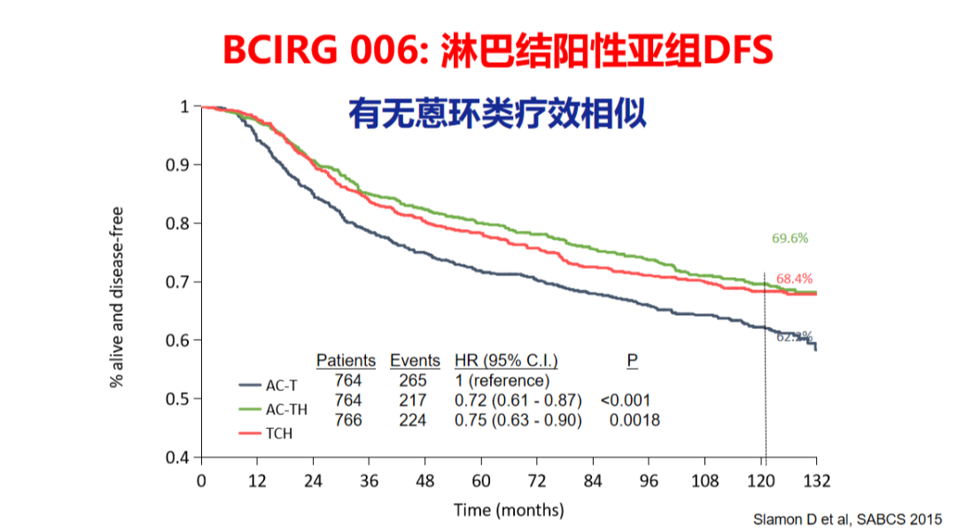 在降阶治疗方面,新辅助治疗也呈现了较为明确的作用。由于含蒽环化疗方案对患者有一定的心脏毒性,当前临床中“去蒽环”呼声较高。BCIRG006研究10.3年随访结果表明,TCH方案心脏毒性更低、继发性白血病更少,且其淋巴结阳性亚组分析显示,有无蒽环对三组患者DFS疗效影响并不大。