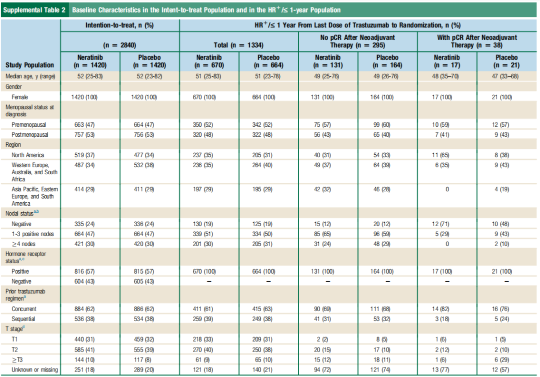 在HR+/≤1年治疗人群中,奈拉替尼组从最后一次用曲妥珠单抗到随机化的中位间隔为3.1个月(范围0.2~12.0个月),而安慰剂组为3.3个月(范围0.3~12.0个月);曲妥珠单抗治疗的中位持续时间分别为11.4个月(范围1.4~29.1个月)和11.4个月(范围1.4~24.0个月)。在HR+/≤1年治疗人群中,有354例(27%)患者接受了新辅助治疗,其中295例患者在进入试验时有残余病灶(non-pCR)(见Supplemental Table 2)。