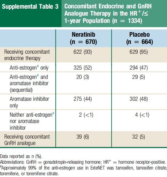 在HR+/≤1年治疗人群中,奈拉替尼组的研究治疗中位持续时间为11.5个月(范围0.0~13.3个月),安慰剂组为11.9个月(范围0.1~12.9个月),平均实际剂量强度分别为210.4 mg / 天(SD,43.9)和235.9 mg /天(SD,11.0)。大多数患者(奈拉替尼组,93%;安慰剂组,95%)在基线时同时接受内分泌治疗。最常用的疗法是仅抗雌激素,主要是他莫昔芬(奈拉替尼组52%;安慰剂组47%)或仅用芳香化酶抑制剂(分别为44%和48%)(见Supplemental Table 3)。