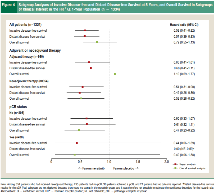 HR+/>1年人群中,奈拉替尼组iDFS率为93.0%(95%CI:86.5%~96.5%),安慰剂组为91.7%(95%CI:85.4%~95.4%),奈拉替尼组绝对获益为1.3%(HR=0.74;95%CI:0.29~1.84)(见Supplemental Figure 2B)。
