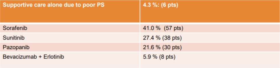 该研究共对159例NCCRCC患者进行了评估,在139例可评估的患者中,71.2%为男性,诊断时的中位年龄为57岁(范围:10~81岁)。组织学亚型包括76.2%乳头状癌、6.5%肉瘤样癌、7.9%嫌色细胞癌、1.4%未分类肿瘤和0.7%嗜酸细胞瘤。51例(32%)患者出现转移;3例因疗效不佳而单独接受支持治疗,39.2%的患者接受索拉非尼、27.4%接受舒尼替尼、21.6%接受培唑帕尼,5.9%的患者接受贝伐单抗埃洛替尼作为一线治疗。