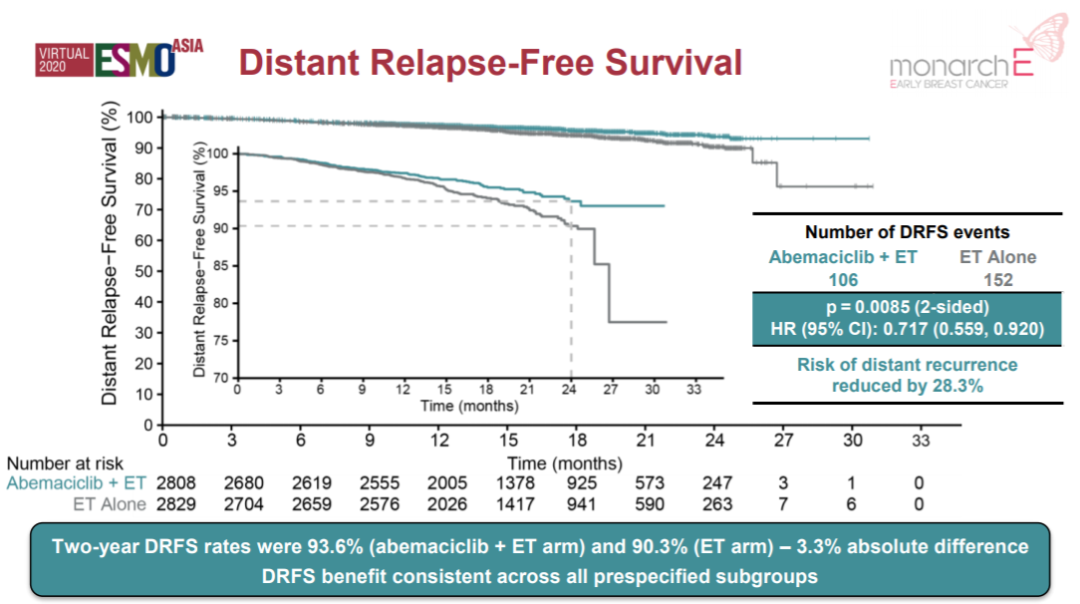 所有预设的亚组中,患者均显示出一致的治疗获益。abemaciclib组患者的2年无远处复发生存率为93.6%,而对照组为90.3%。从Abemaciclib组和对照组的IDFS曲线趋势来看,随着随访时间的延长,两者的IDFS获益会有更大的差异。Abemaciclib组能够在15.5个月的随访时间内就观察到相比对照组3.5%的IDFS绝对获益,继续随访2-3年,二者IDFS曲线的走势会更加分开。绝大部分患者尚未达到研究设定的Abemaciclib两年的用药时间,因此,未来的获益优势值得期待,monarchE研究将继续开展直至研究完成。