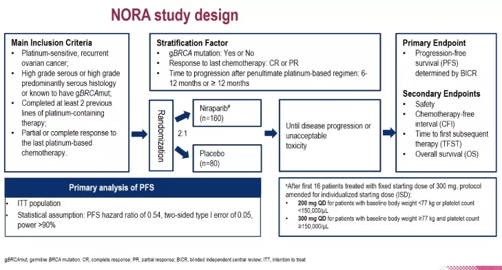 NORA是一项双盲、随机、安慰剂对照的 III期临床研究(NCT03705156),在中国32家医院进行,纳入了年龄≥18岁的高级别浆液性组织学或种系BRCA突变的PSROC患者,这些患者完成最后一轮含铂化疗后达到完全或部分缓解。NORA研究将265名患者以2:1比例随机分组,接受口服niraparib(300 mg,每日一次)或安慰剂的治疗。除方案之初的16名患者接受了300mg的固定起始剂量,其余249名患者(ITT人群占比94%)都接受了个体化起始剂量(基线体重≥77kg、血小板计数≥150×103/mol/L的患者为每天300 mg,其他患者为每天200 mg作为起始剂量)。主要终点为独立盲法中心评估的PFS。