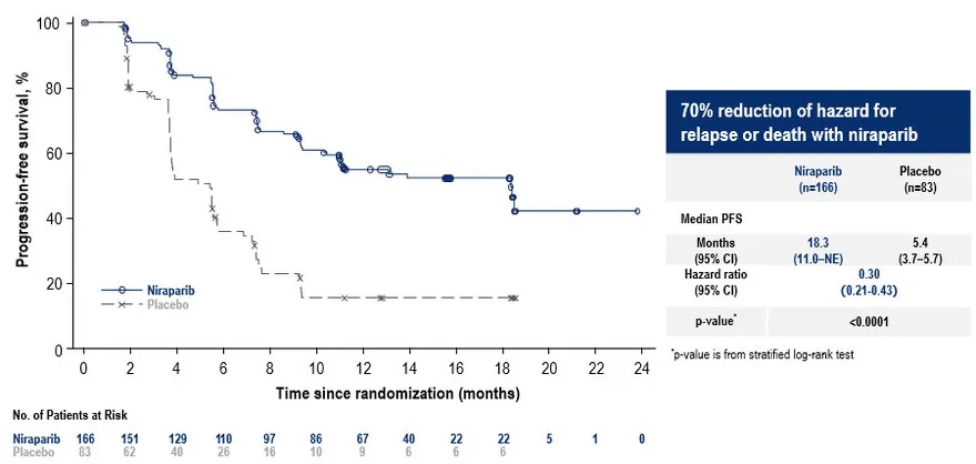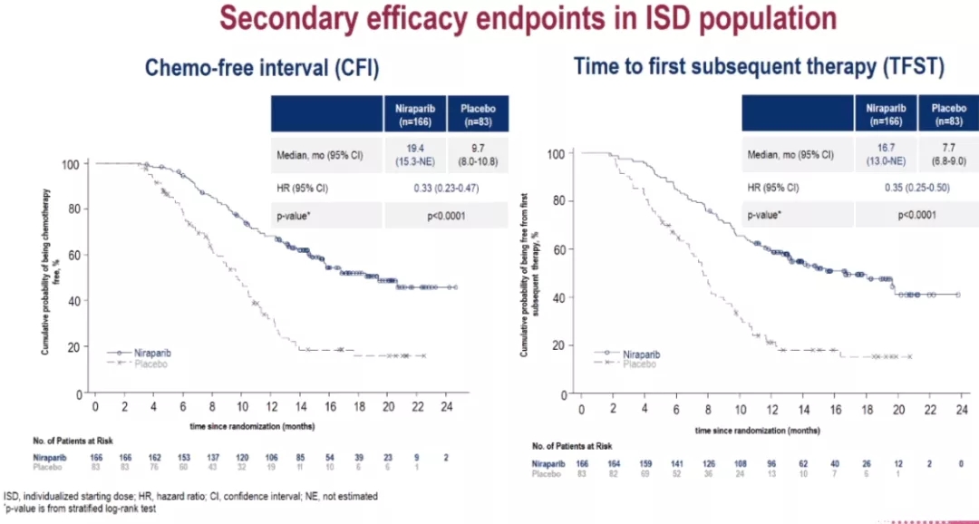 在次要终点无化疗间期(CFI)方面,niraparib组相比安慰剂组有显著延长:19.4 vs 9.7个月 (HR=0.33, 95%CI: 0.23~0.47;P<0.0001);至第一次后续治疗开始时间(TFST),niraparib组和安慰剂组分别为16.7 vs 7.7个月 (HR=0.35, 95%CI: 0.25~0.50;P<0.0001);
