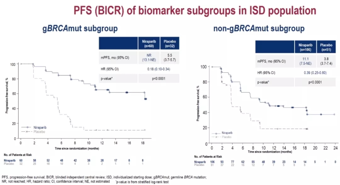 所有预设亚组分析均显示,niraparib较安慰剂组有显著的PFS获益。gBRCA突变亚组PFS延长更显著:niraparib组目前仍未达到中位值,安慰剂组为5.5个月 (HR=0.18, 95%CI: 0.10~0.34;P <0.0001)。在非gBRCA突变亚组,niraparib组相比安慰剂组的PFS也有显著延长:11.1个月vs 3.8个月(HR=0.39,95%CI: 0.25~0.60;P <0.0001);