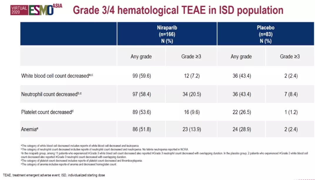 安全分析数据:≥3度治疗紧急不良事件发生率在niraparib组和安慰剂分别为48.8%和20.5%;≥3级血液学治疗相关不良事件(TEAEs)方面,白细胞计数降低在niraparib组和安慰剂的发生率为7.2%和2.4%,中性粒细胞减少分别为20.5% vs 8.4%,血小板计数下降为9.6% vs 1.2%,贫血分别为13.9% vs 2.4%。
