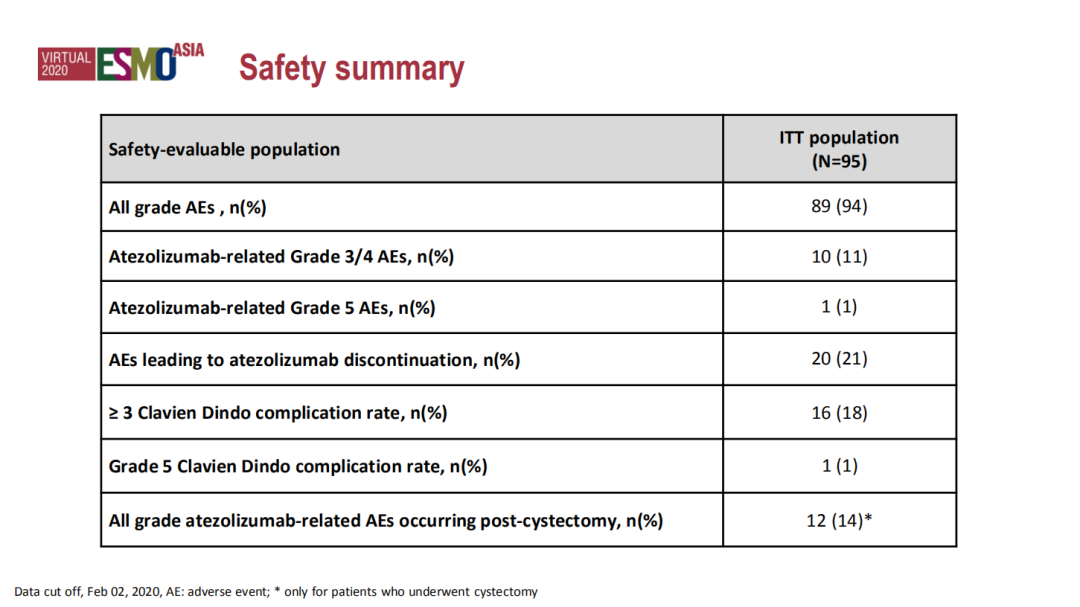 ABACUS是一项单臂Ⅱ期临床试验,目的是探究对拟进行膀胱癌根治术(RC)的MIBC(T2-4aN0M0)患者行两周期的Atezolizumab(阿替利珠单抗,每三周1200mg)治疗的疗效和安全性。试验总共入组了95名对顺铂不耐受或者拒绝新辅助顺铂化疗,并且病理证实为尿路上皮癌的患者(其中8名患者最终未接受RC治疗),病理完全缓解(pCR)为主要研究终点,同时评估免疫治疗副反应以及手术相关并发症。