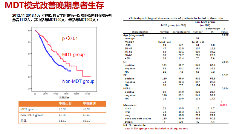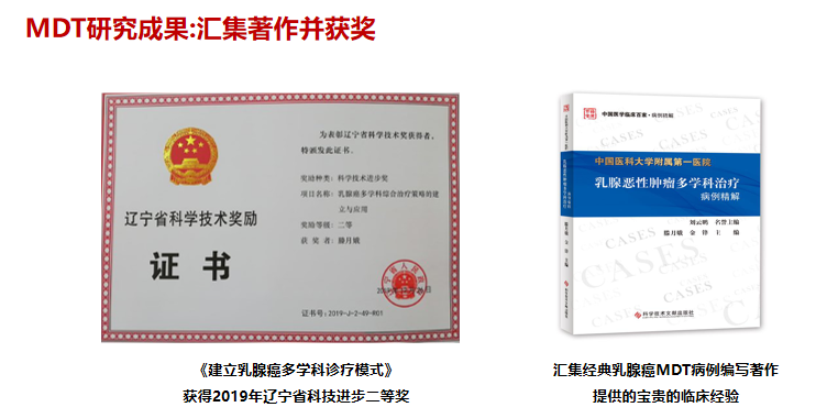 第三,重随访。MDT年终总结大会如今已经举办七届,每年会上都会对经治患者的生存结局进行随访和总结,以明确经过MDT诊疗意见的处理是否给患者真正带来生存获益。此外,MDT总结会上我们还会把部分患者的治疗结果反馈给相关专家,通过总结MDT策略制定过程中的经验和教训,明确和验证治疗方案是否需要进一步优化,以实现规范化诊治过程中精准的个体化治疗。通过中位随访22个月,我们的乳腺癌MDT诊疗模式真正给晚期乳腺癌患者带来生存获益。通过多年的积淀,MDT成果已经于2019年获得辽宁省科技进步二等奖,并编著了《中国医科大学附属第一医院乳腺恶性肿瘤多学科治疗病例精解》一书。