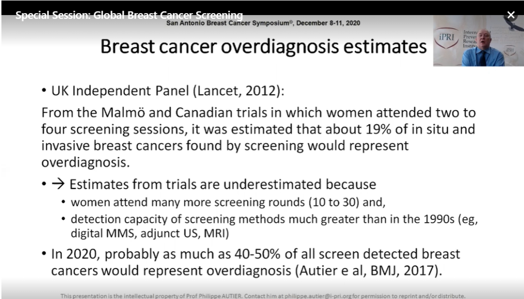 编者按:众所周知,开展乳腺癌筛查可以早期发现患者病灶,减少乳腺癌死亡,减少使用激进疗法并为患者提供乳房再造的能力。避免了疾病晚期而带来经济收益,以及所有与这些相关的心理、社会和生活质量的提高。但是,在SABCS 2020大会上“Global Breast Cancer Screening”特别专场上,Philippe Autier博士带来了“权衡乳腺癌筛查的利弊”的讲课,提醒临床医生需要考虑一些潜在的弊端。