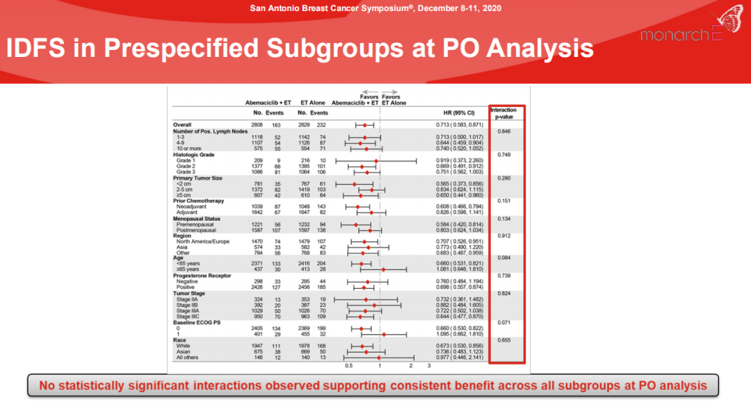 此次报道的MonarchE研究主要终点(PO)分析,其中位随访较前期报道延长了3.6个月,达到了19.1个月,共有395个IDFS事件。其结果再次证实,阿贝西利联合内分泌辅助治疗早期高危HR+/HER2-乳腺癌,可显著降低患者的IDFS风险和DRFS风险,并且安全性与IA2及阿贝西利已知安全性一致。