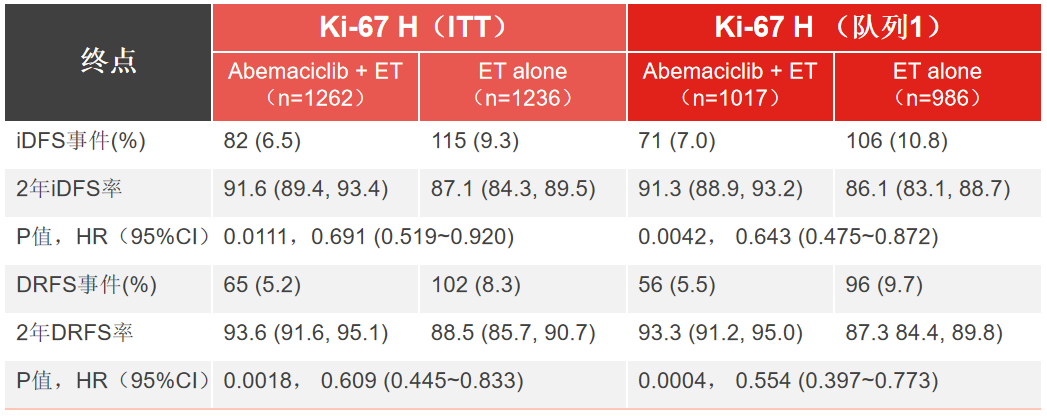 ITT人群中有4425例(78.5%)进行了原发灶Ki-67检测,其中2498例Ki-67≥20%(阿贝西利组1262例,ET组1236例)。共观察到197例IDFS事件,其中阿贝西利组82例,单独ET组115例。在ITT人群Ki-67 H(≥20%)患者中,阿贝西利+ET较单独ET治疗显著降低30.9%的侵袭性疾病风险(HR 0.691,95%CI:0.519~0.920,P=0.0111),2年IDFS率分别为91.6%和87.1%,绝对获益为4.5%。