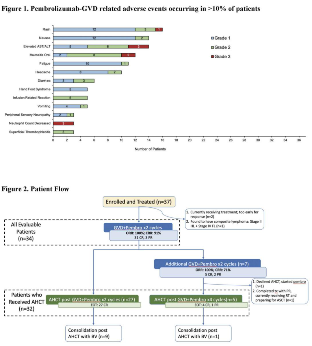 在纳入的39名患者中,37名可进行毒性分析(2名患者尚未开始治疗),34名可进行疗效分析(4名患者评估时间未达到,1名患者入组后发现有复合淋巴瘤)。入组的37名患者中,中位年龄36岁(范围21-71),43%为男性,62%(23)为疾病晚期,41%(15)为原发难治性cHL。关于RR cHL的危险因素(B症状、结外淋巴瘤、初始治疗后1年内的复发/难治HL),37名患者中,11%(4)无任何危险因素(RFs), 57%(21)有1个RFs, 24%(9)有2个RFs, 8%(3)有3个RFs。