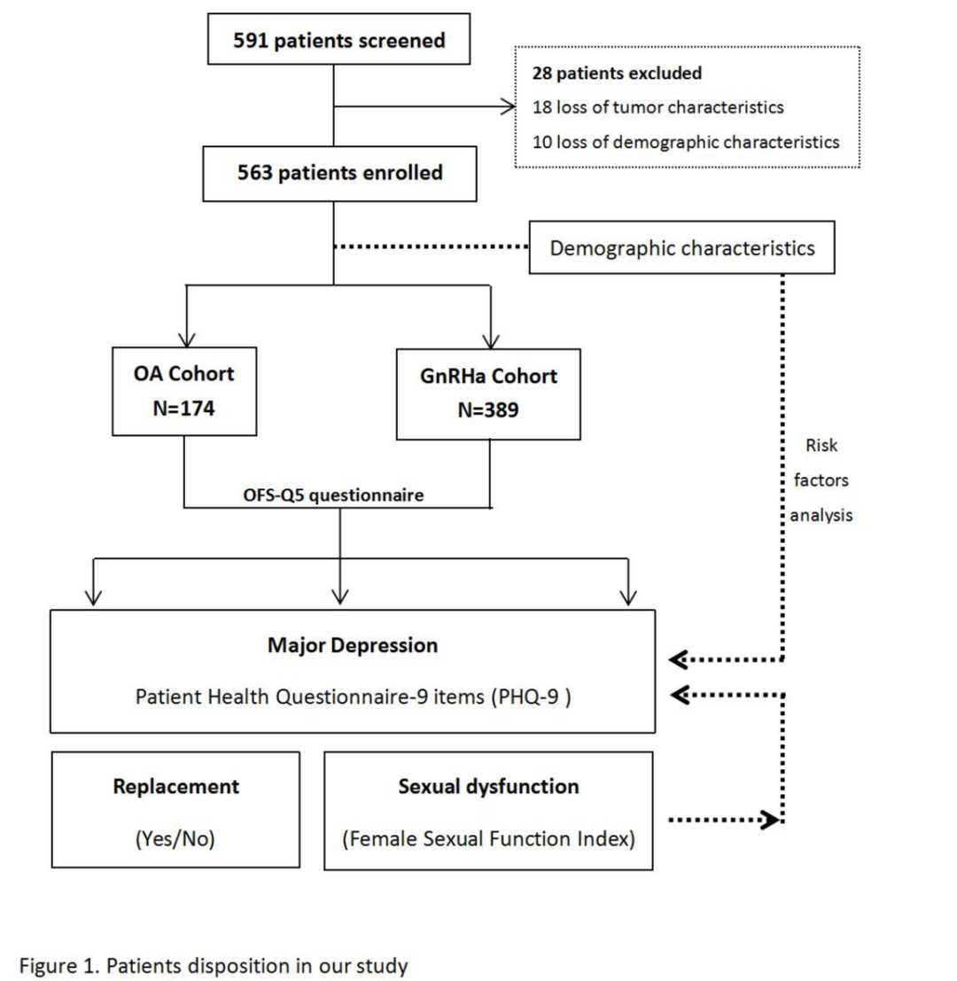 研究纳入了从2019年6月至2020年6月来自全国7家三甲医疗机构的乳腺癌患者共计563例,药物OFS治疗患者389例,卵巢切除术患者174例,采用患者健康问卷(PHQ-9)对抑郁症患者进行评估,并用QLQ-BR23和FSFI女性性功能指数问卷对其进行生活质量和性功能评估。调研问卷咨询患者是否愿意接受其他方式的卵巢功能抑制,以期评估患者目前接受卵巢功能抑制方式的满意程度。