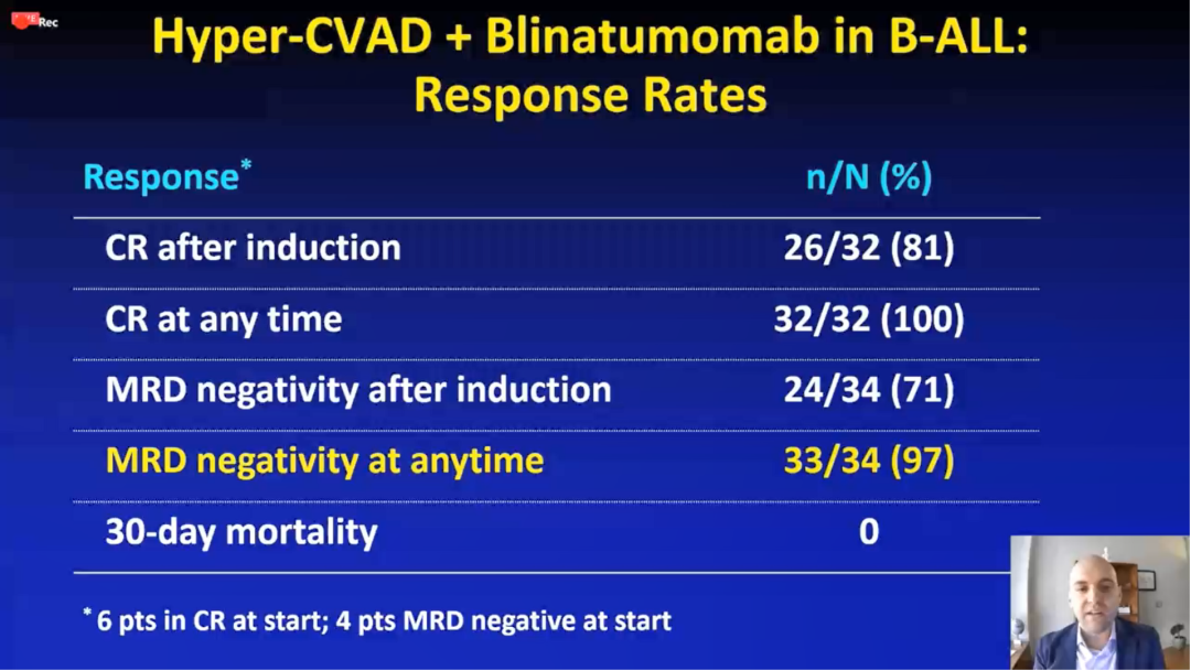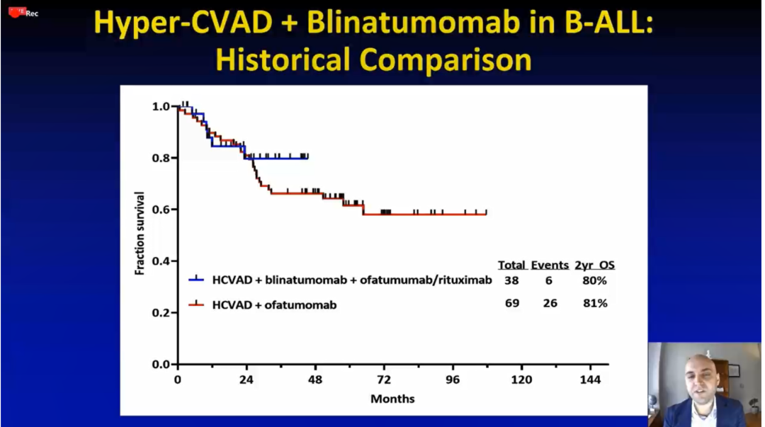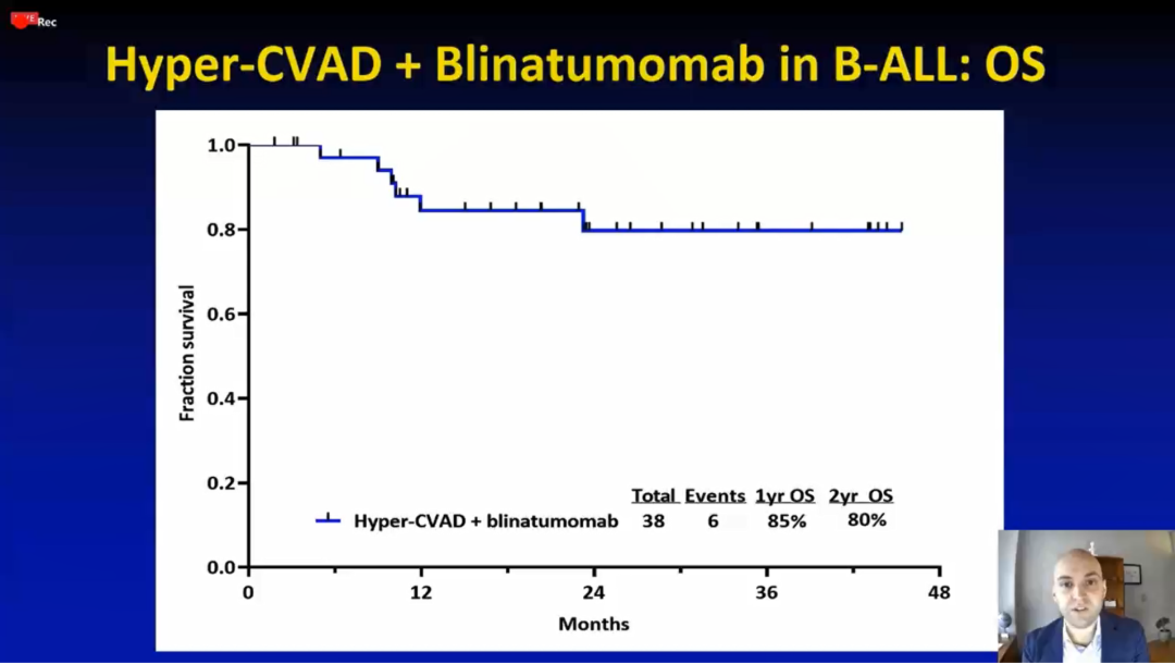 高剂量CVA与blinatumomab序贯联合治疗作为Ph- B细胞ALL患者的一线治疗前景广阔,CR率是100%,97%的患者实现MRD阴性。生存数据很有前景,估计2年OS为86%。