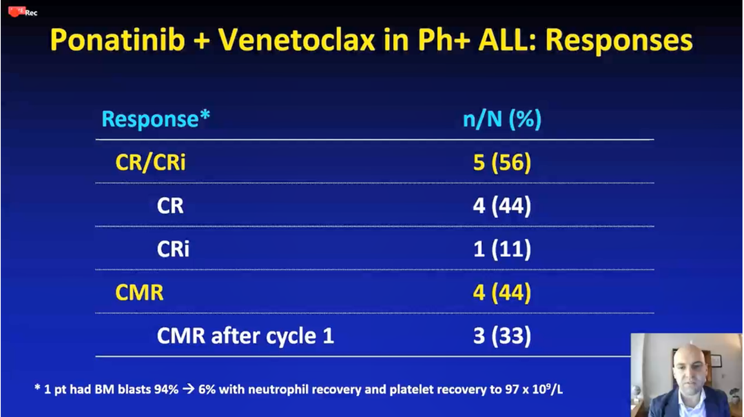 在患有R/R Ph + ALL的患者的强化预治疗人群中,普纳替尼联合维奈克拉和地塞米松的无化疗口服联合安全且具有良好的早期疗效,每日接受维奈克拉 800 mg的所有3例患者均达到了CMR。尚未达到MTD,研究继续进行。