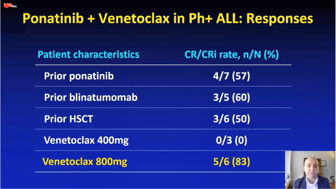 截止目前共纳入8例患者,有6例患者接受了治疗,并且安全性和有效性均可评价。3例患者每日接受维奈克拉400 mg,3例患者每日接受维奈克拉 800 mg。给予的中位疗程数为3周(范围,1-8)。未观察到剂量限制性毒性,但同时尚未达到MTD。非血液相关的3-4级不良事件包括:ALT/AST升高和发热性中性粒细胞减少(各2例患者),消化道出血、精神状态改变、下肢无力和感染(各1例患者)。无早期死亡。中位年龄为53岁(范围:27-73岁)。所有患者既往均接受过异基因造血干细胞移植。既往治疗的中位数为3.5(范围,2-4),既往TKIs的中位数为2(范围,1-3)。5例患者(83%)既往接受过普纳替尼治疗,4例患者(67%)接受过blinatumomab治疗。3例患者(50%)有髓外疾病,5例接受ABL1激酶结构域检测的患者中的3例(60%)可检测到T315I突变。