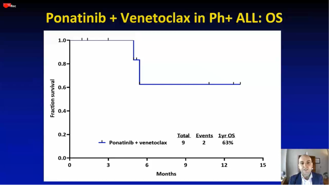 有效性方面:①4例患者(50%)达到CR,1例患者达到CRi。值得注意的是,所有达到CR的患者均接受了800 mg每日剂量的维奈克拉。其中2例既往接受过普纳替尼治疗,2例接受过blinatumomab的患者。1例接受维奈克拉400 mg每日一次的患者在第1周期后骨髓原始细胞从94%降至6%,中性粒细胞完全恢复,血小板恢复至97 x 109/L(但不符合部分缓解的正式标准)。在达到CR的3例患者中,也同时都达到了CMR并继续参加研究。在末次随访时,所有缓解患者仍处于持续CMR中,缓解持续时间分别为1个月、5个月和8个月。中位随访持续时间为8.6个月,截止发表中位OS尚未达到,估计9个月OS率为60%。