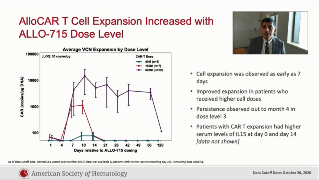 这些早期数据提示ALLO-715和ALLO-647有着可控的安全性。ALLO-715在复发难治性多发性骨髓瘤患者(R/RMM)的同种异体治疗表现出一定的临床有效性,并且临床效果与细胞剂量呈正相关。