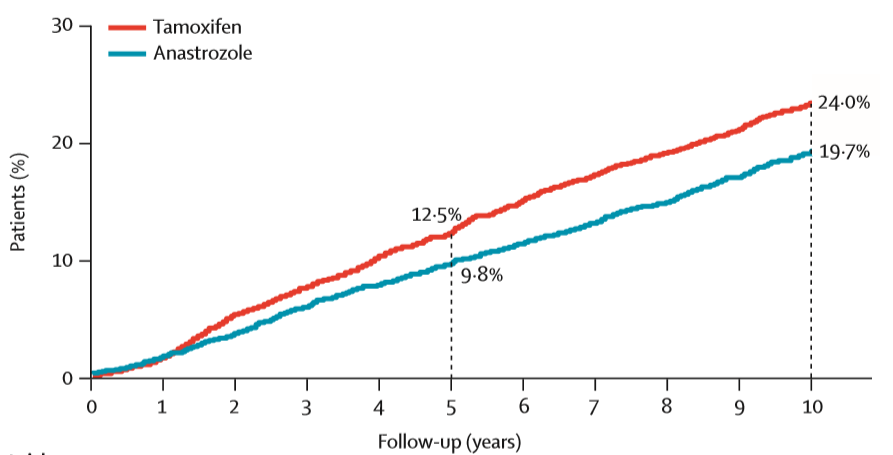 图3:HR+患者中的TTDR 10年结果(红线:他莫昔芬;蓝线:阿那曲唑)