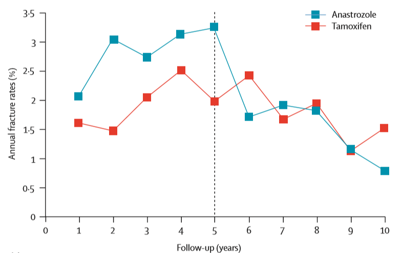 在治疗期间,阿那曲唑组患者相比他莫昔芬组的骨折发生率更为频繁 (451 vs 351;OR=1.33,95%CI: 1.15-1.55,P<0.0001) ,但在治疗后的随访阶段,两组的骨折发生率类似 (110 vs 112;OR=0.98,95%CI: 0.74-1.30,P=0.9)。