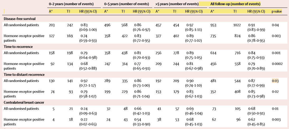 在HR+患者中,与他莫昔芬组相比,阿那曲唑组的DFS (HR=0.86, 95%CI: 0.78-0.95,P=0.003) ,TTR (HR=0.79, 95%CI: 0.70-0.89,P=0.0002) 和TTDR (HR=0.85, 95%CI: 0.73-0.98,P=0.02)也 均显著延长。