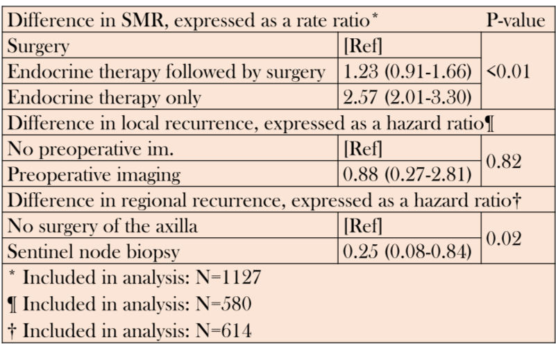 结果:该研究共纳入1142例患者,平均年龄为77岁。中位随访为7.80年,795例(69.6%)死于随访,6.25年出现复发。52例为局部复发,39例为区域复发。仅接受内分泌治疗的患者的SMR明显高于接受手术的患者(adj. RR=2.57;95%CI:2.01~3.30),而接受内分泌治疗后手术的患者未显著高于接受手术的患者(RR=1.23;95%CI:0.91~1.66)。580位BCS患者中有253人(43.6%)未接受术前影像学检查。无影像学检查的患者局部复发的风险并不高于有影像学检查的患者,(adj. HR=1.14;95%CI:0.36~3.67)。197名接受手术治疗但未接受腋窝手术的患者中,有13人(6.8%)发生局部复发,而428例腋窝前哨淋巴结活检的患者中只有7例(1.6%)出现局部复发。这种差异是具有显著性(adj. HR=4.68;95% CI:1.53~14.37)。