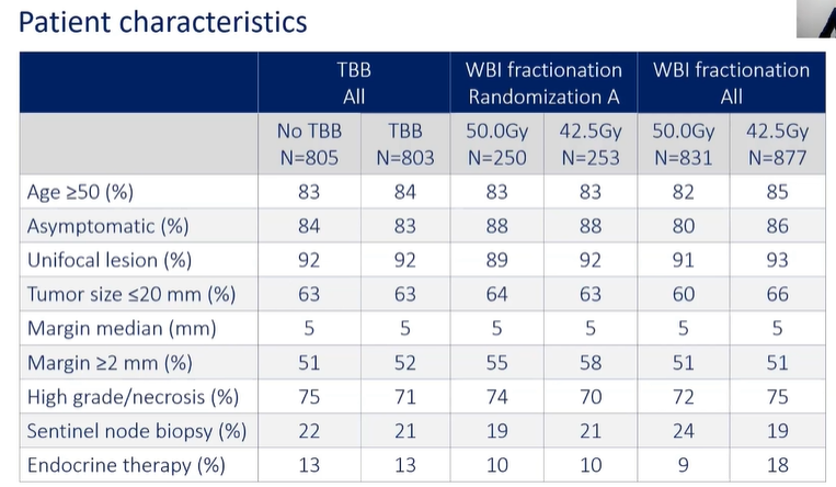 在2003年4月16日至2009年12月22日期间,有1326名65岁以上的早期乳腺癌妇女被判定为低风险(即激素受体阳性,腋窝淋巴结阴性,T≤3cm,大小和边缘无累及;保乳手术并接受辅助内分泌治疗的3级肿瘤组织学或淋巴管浸润,但不能同时允许)。符合条件的患者被随机分配为全乳房放疗(40-50 Gy/15-25F)或不进行放疗。主要终点是同侧乳腺肿瘤复发。