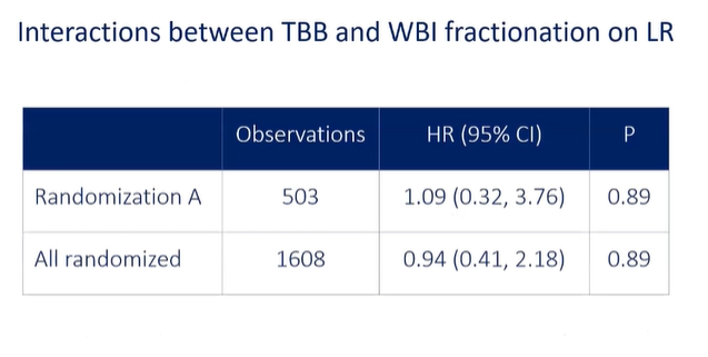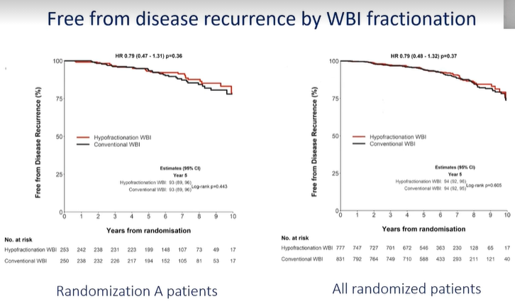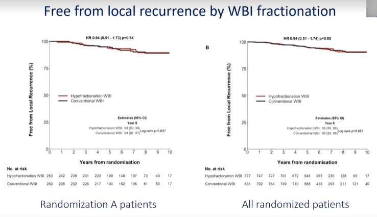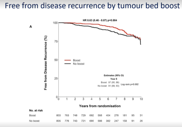 2007年6月至2014年6月,1608例患者被随机分为无局部加量组(805例)和局部加量组(803例)。831例患者接受常规WBI治疗(416例无加量;415名患者加量)。777例患者给予大分割放疗(389例患者无加量,388例患者加量)。无加量组106例(13%)和加量组105例(13%)采用辅助内分泌治疗。平均随访时间为6.6年。无加量组5年无局部复发率为93%,加量组为97%(HR=0.47,95%CI:0.31~0.72,P<0.001)。瘤床加量组的获益与年龄、肿瘤大小、核分级、手术切缘、内分泌治疗与否均无相关性。全乳放疗常规分割与大分割,在五年无局部复发率上没有显著差异(95% vs .95%,P=0.89)。两组之间2级以上的乳房疼痛、皮肤及皮下纤维化大致相仿。