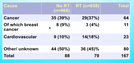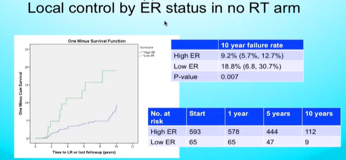 658名接受保乳手术并接受辅助内分泌治疗的患者被随机分配接受全乳照射,另有668名妇女不接受放疗。在中位随访10年后,同侧乳腺肿瘤复发率,未接受放疗和放疗组分别为9.8% vs 0.9%(P=0.0008),但对10年总生存和无转移相关生存无明显影响(80.4% vs 81%,98.1% vs 96.4%),ER高表达组现对于ER低表达组10年局控失败率分别9.8% vs 18.8%(P=0.007),放疗组和非放疗组因乳腺癌的死亡率分别为9%和4%。